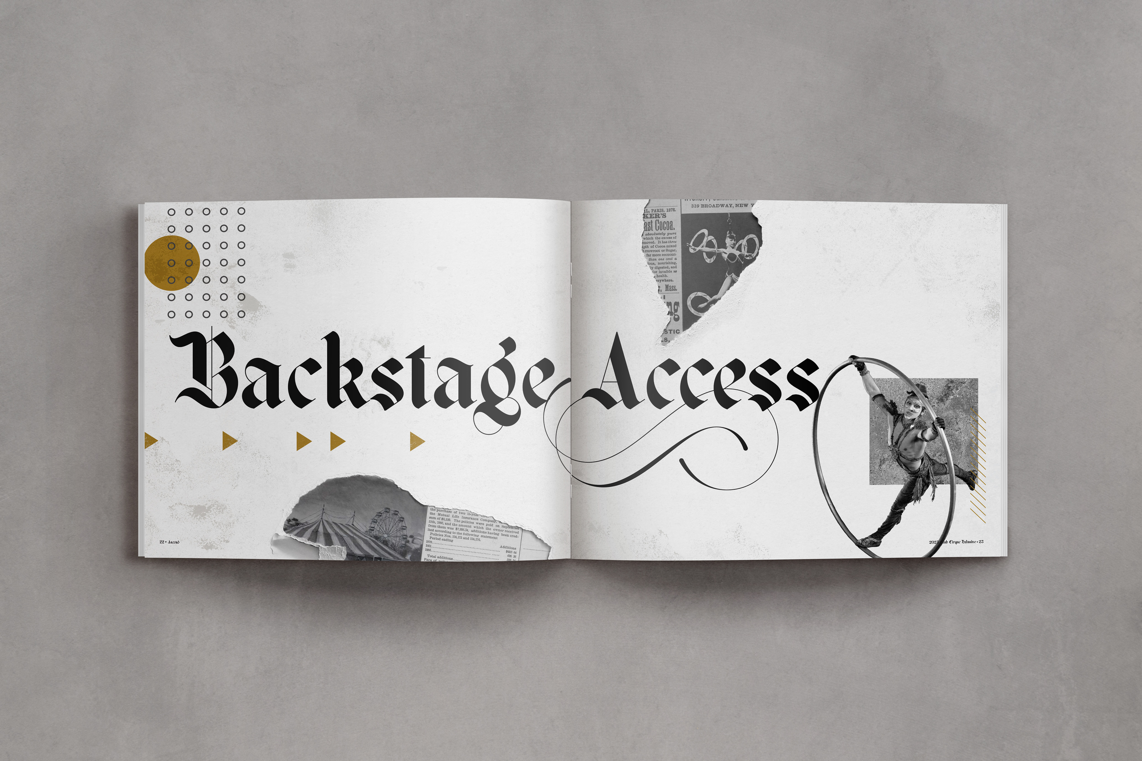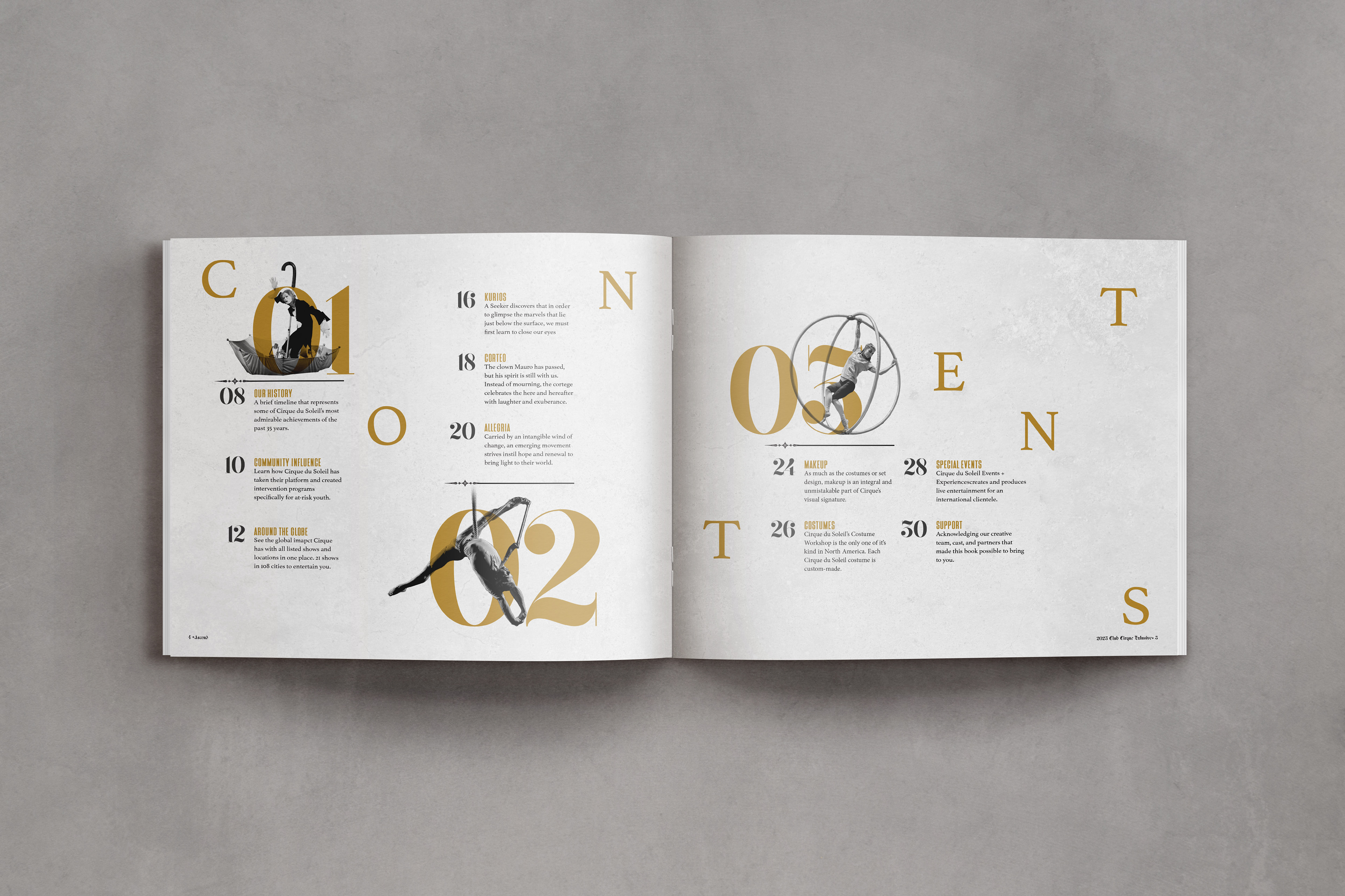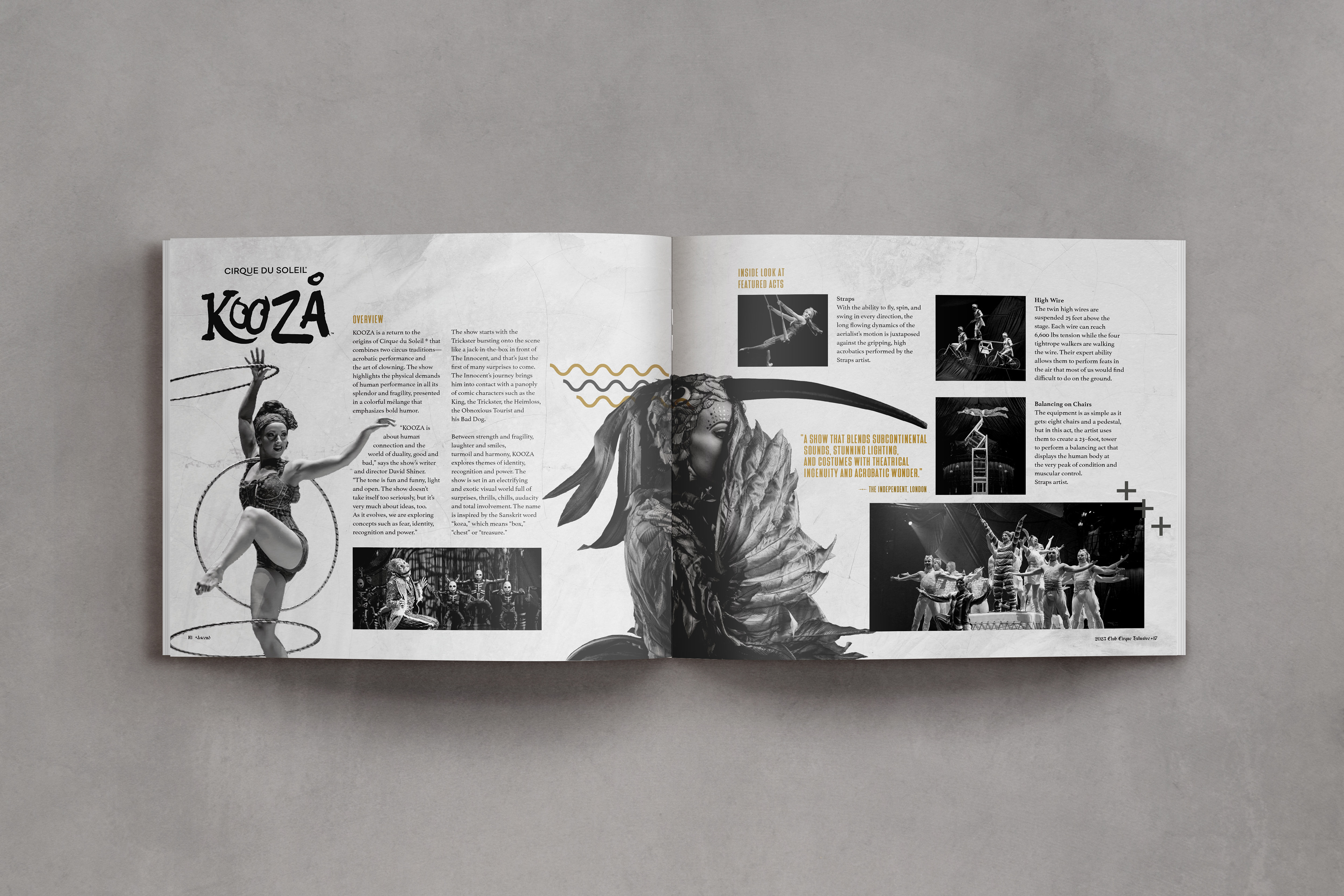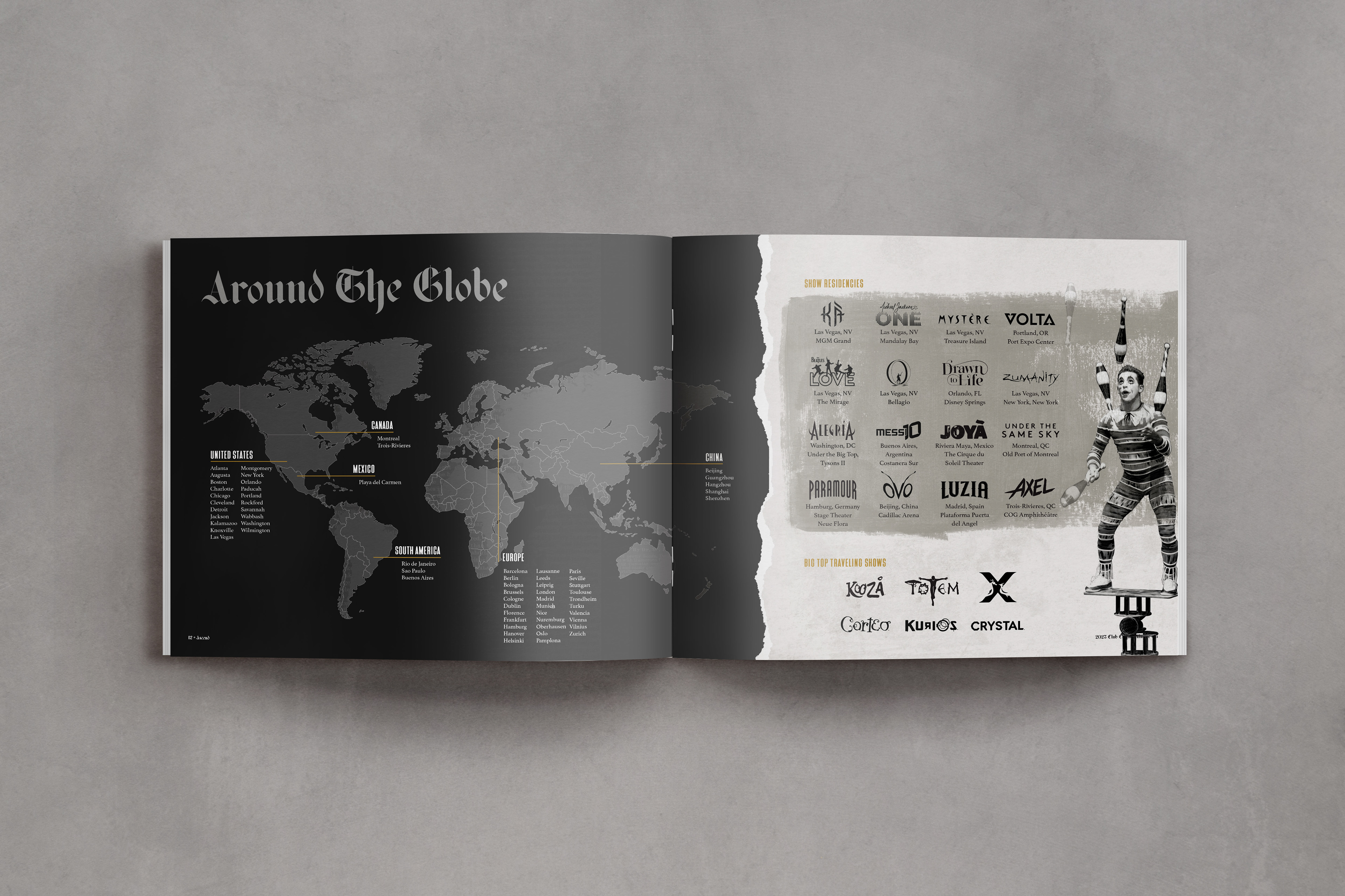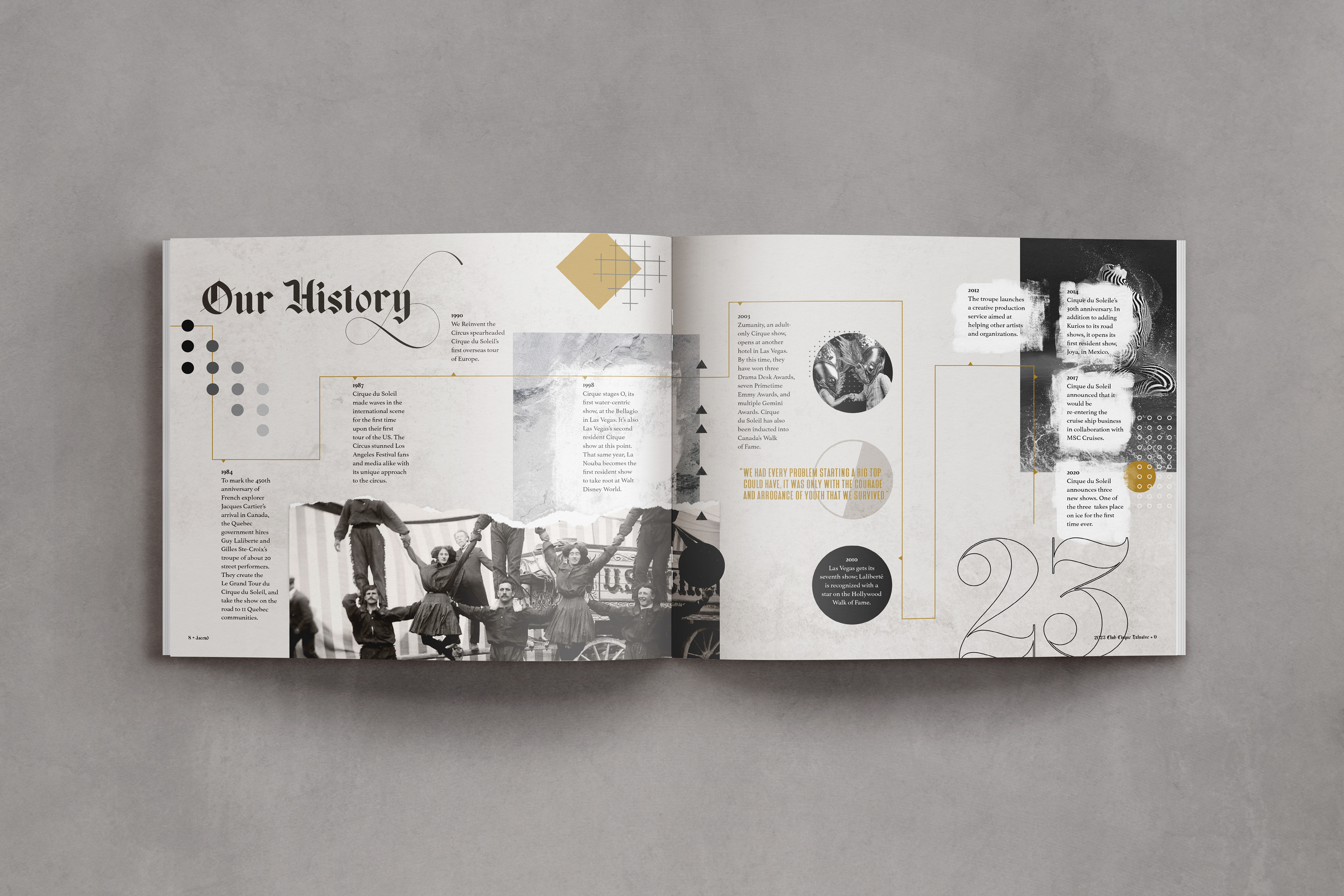 An exclusive anniversary tribute from Cirque du Soleil to Club Cirque fans. This publication shares the story of founder Guy Laliberté and the Cirque's successes. Features include black and white photography, texture, and exquisite typography.